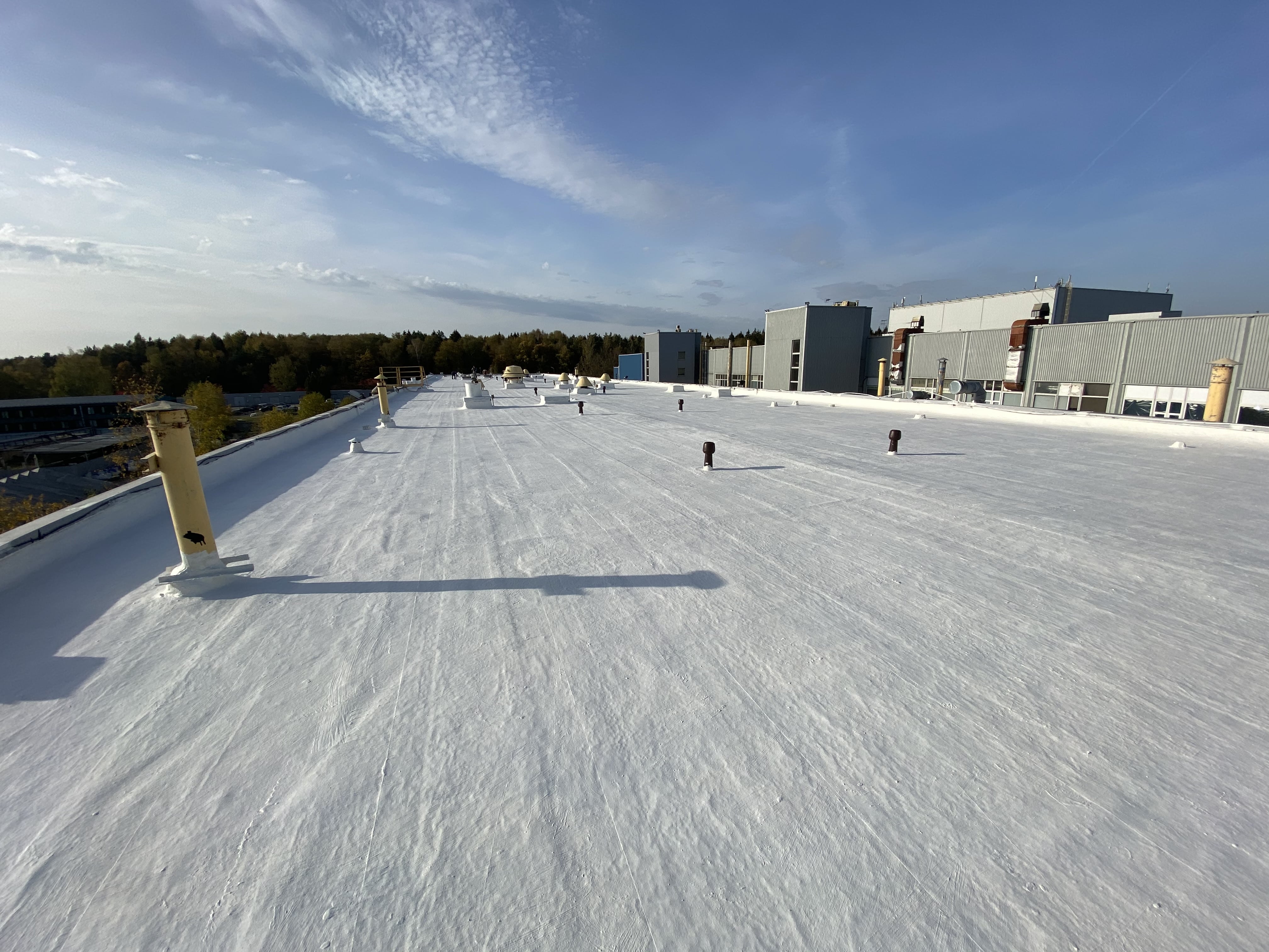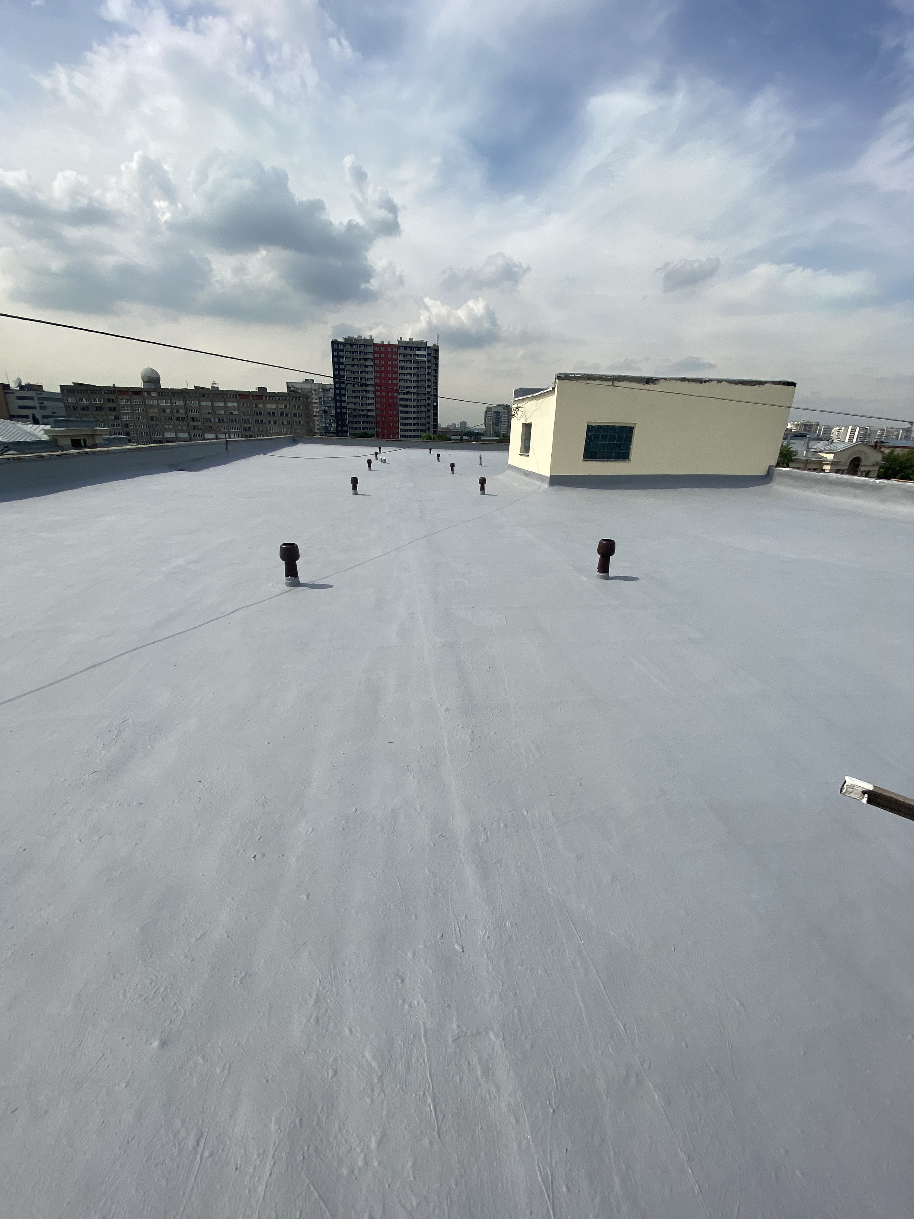 После полимеризации покрытие становится частью основания и представляет собой бесшовную, водонепроницаемую, стойкую к УФ - излучению мембрану, армированную полотном.